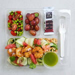 A complete and flavorful platter, where coconut-coated shrimp are served on a bed of mixed greens, cilantro, cucumber, and pink grapefruit for a burst of freshness. Roasted peanuts and pickled ginger add a generous crunch and subtly spicy notes, while fresh cilantro delicately perfumes the whole dish. A creamy, well-balanced peanut vinaigrette harmonizes every bite. As a side, a salad of cherry tomatoes and edamame adds even more freshness and vitality. To finish, let yourself be seduced by the sweetness of a bunch of grapes and the intensity of Isabelle Huot 70% dark chocolate.